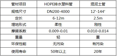 HDPE(高密度聚乙烯)塑料管材是一種內(nèi)壁光滑,由螺旋纏繞或擠塑工藝制成的非金屬塑料管材,該管材不僅具有良好的經(jīng)濟(jì)性,而且具備接口穩(wěn)定可靠、材料抗沖擊、抗開裂、耐老化、耐腐蝕等一系列優(yōu)點(diǎn)?;炷凉苡射摻钭鳛榧訌?qiáng)骨架與水泥沙漿復(fù)合而成。混凝土管的原材料較易獲得,價(jià)格較低,制造簡單方便;主要缺點(diǎn)是抗腐蝕性較差,不宜輸送酸性、堿性較強(qiáng)的工業(yè)廢水;管節(jié)較短,接頭多,施工復(fù)雜,抗?jié)B、抗漏性差。