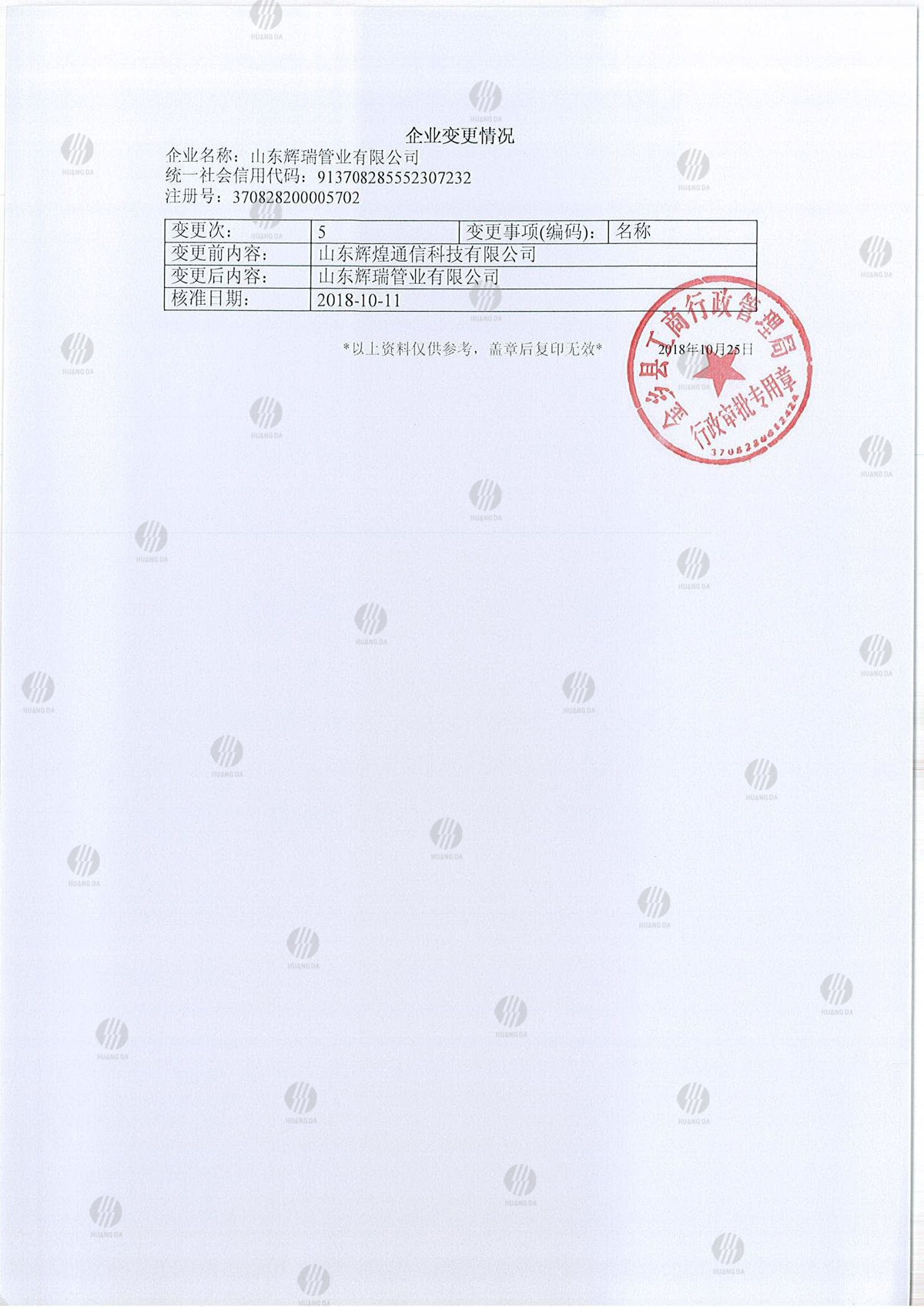 山東輝煌通信科技有限公司正式更名為山東輝瑞管業(yè)有限公司