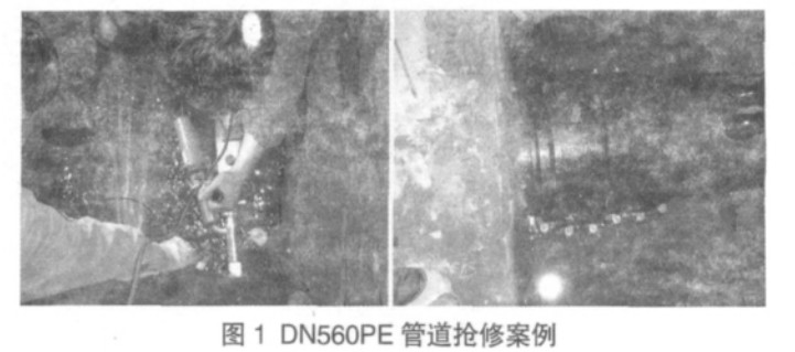 上述方法不需切斷管材,一般不用停水只需降壓處理,3 小時(shí)內(nèi)可完成施工,大大縮短了搶維修時(shí)間,提高了搶維修效率。圖 1 為一處 DN560PE 管道的搶修案例。