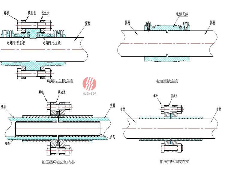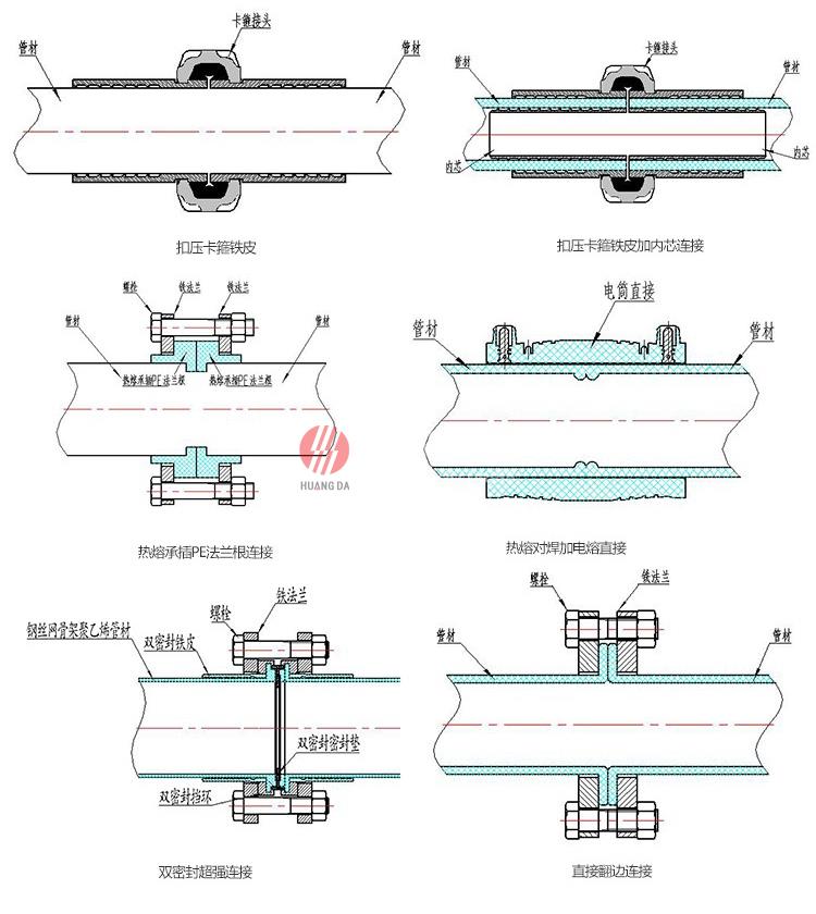 山東輝煌通信科技有限公司的管道工程師根據(jù)多年的經(jīng)驗,整理了鋼絲網(wǎng)骨架符合管連接方式的錦集,包含了法蘭連接、電熔管件連接、卡箍連接等等